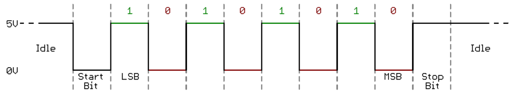 - Stop bit(s): 1 hoặc 2 bit cao (logic 1) để báo kết thúc