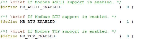 Để chọn chế độ hoạt động là ModbusRTU, các bạn cần Enable nó ở file header mbconfig.h. Trong file này có 3 byte tương ứng với 3 chế độ, các bạn sử dụng chế độ nào thì các bạn ghi 1, còn lại ghi 0
