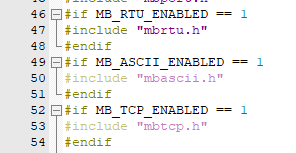 Lúc này ở file mb.c, các bạn sẽ thấy ModbusRTU được định nghĩa, 2 chế độ kia bị ẩn đi do không được định nghĩa